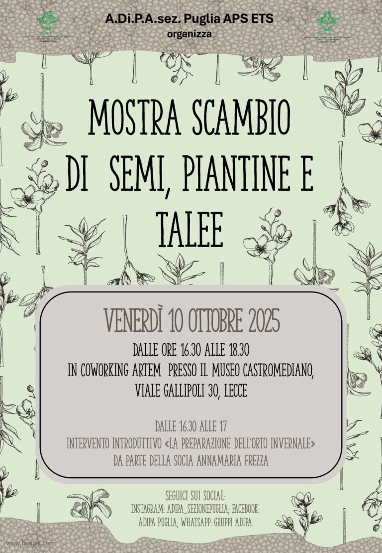 Mostre Scambio Ultimi appuntamenti per tutta Italia Liguria A.Di.P.A. Sezione Liguria: MOSTRA – SCAMBIO di AUTUNNO Domenica 26 ottobre 2025 la Sezione Liguria ha tenuto la sua Mostra Scambio d’Autunno nella Villa Duchessa di Galliera a 28/10/2025 Lombardia A.Di.P.A. Sezione Lombardia: MOSTRA – SCAMBIO di AUTUNNO Sabato 18 ottobre 2025 A.Di.P.A. Sezione Lombardia ha in programma la MOSTRA SCAMBIO autunnale! Vi aspettiamo numerosi ospiti del Comune di Milano 14/10/2025 Puglia A.Di.P.A. Sezione Puglia: i venerdì con la Mostra Scambio al Museo Riprendono gli appuntamenti al Museo Castromediano di Lecce con la Mostra Scambio ogni primo venerdì del mese dalle 16.30 alle 18.30 Venerdì 07/10/2025 MOSTRA SCAMBIO di AUTUNNO con A.Di.P.A Sede Centrale Domenica 28 settembre 2025 si è svolta la Mostra – Scambio autunnale organizzata dalla Sede Centrale. Il sotterraneo del Baluardo 30/09/2025 Eventi Segui le attività di A.Di.P.A sul territorio Piante d’appartamento e gioventù in città a cura di A.Di.P.A. Sezione Piemonte Fiori ed ortaggi nel giardino della scuola con A.Di.P.A. Sezione Piemonte Ghirlande all’Orto botanico di Lucca insieme a A.Di.P.A. Sede Centrale 8 dicembre nel giardino di Maria Luisa con A.Di.P.A Sezione Puglia ASSOCIATI AD A.Di.P.A. Diventa nostro socio e usufruisci dei tanti vantaggi che possiamo offrirti ASSOCIATI ORA Dona il tuo 5x1000 C.F. 92009790467