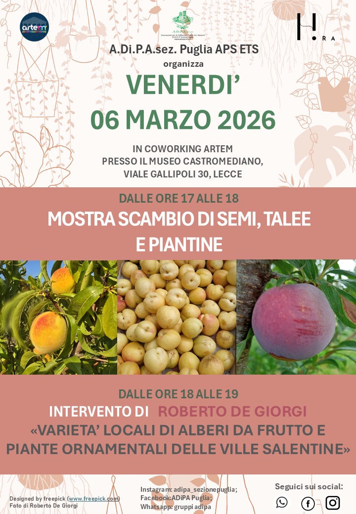 Mostre Scambio Ultimi appuntamenti per tutta Italia Puglia Venerdì 6 Marzo 25/02/2026 Puglia A.Di.P.A. Sezione Puglia: Riprendono i venerdì al Museo Castromediano di Lecce con la Mostra Scambio 07/02/2026 Liguria A.Di.P.A. Sezione Liguria: MOSTRA – SCAMBIO di AUTUNNO Domenica 26 ottobre 2025 la Sezione Liguria ha tenuto la sua Mostra Scambio d’Autunno nella Villa Duchessa di Galliera a 28/10/2025 Lombardia A.Di.P.A. Sezione Lombardia: MOSTRA – SCAMBIO di AUTUNNO Sabato 18 ottobre 2025 A.Di.P.A. Sezione Lombardia ha in programma la MOSTRA SCAMBIO autunnale! Vi aspettiamo numerosi ospiti del Comune di Milano 14/10/2025 Eventi Segui le attività di A.Di.P.A sul territorio Le spontanee italiane: medicina, storia, ricette. A cura della Dott.ssa Eleonora Matarrese A.Di.P.A. in visita all’Orto Botanico di Genova Visita guidata all’Orto Botanico di Genova Conferenza su ‘La Flora salentina’ a cura del Dott. Piero Medagli ASSOCIATI AD A.Di.P.A. Diventa nostro socio e usufruisci dei tanti vantaggi che possiamo offrirti ASSOCIATI ORA Dona il tuo 5x1000 C.F. 92009790467