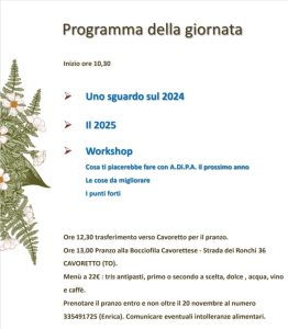 La mattinata è stata animata dalla distribuzione a tutti di bulbulli di Amaryllis belladonna, di semi ai “Custodi”(torneremo su questo punto in futuro), dei manuali sulle semine e di felpe e magliette A.Di.P.A. a chi doveva ancora ritirarle, dai rinnovi 2025, dalla possibilità di fare colazione con caffe’ , bibite e pasticcini e si è conclusa con un pranzo sociale sulla collina torinese.