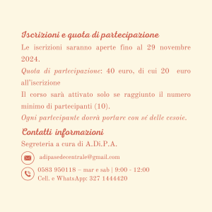Quota di partecipazione da corrispondere all’Associazione A.Di.P.A. APS ETS è di 40 euro, di cui 20 euro all’iscrizione.