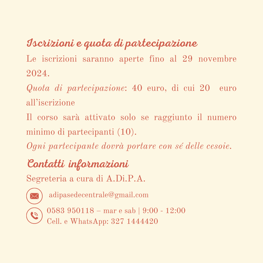 Le iscrizioni saranno aperte fino al raggiungimento di 10 partecipanti per corso entro il 29 novembre 2024.