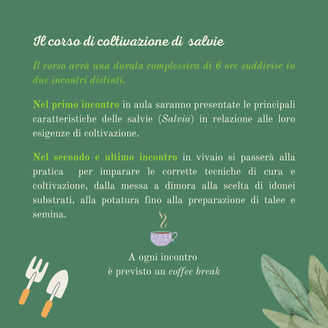 Incontro in aula – Saranno presentate le principali caratteristiche delle salvie in relazione alle loro esigenze di coltivazione.