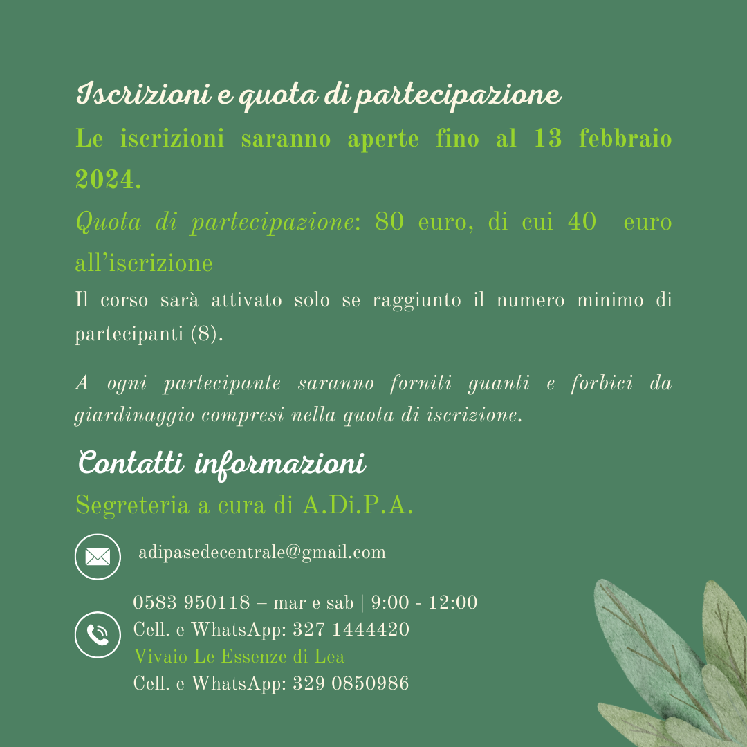 Le iscrizioni saranno aperte fino al 5 novembre 2024, la quota di partecipazione da corrispondere all’Associazione A.Di.P.A. APS ETS è di 80 euro, di cui 40 euro all’iscrizione. A ogni partecipante saranno forniti guanti e forbici da giardinaggio compresi nella quota di iscrizione.