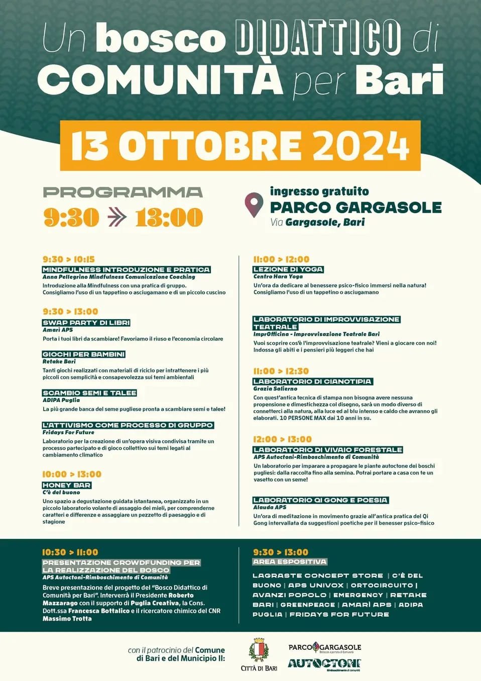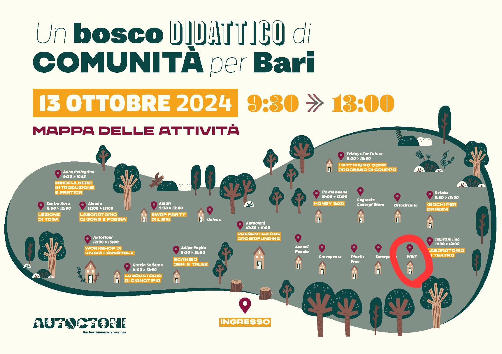 Sulle locandine il programma della manifestazione e la mappa delle attività che si svolgeranno nel “Bosco Didattico di Comunità per Bari”