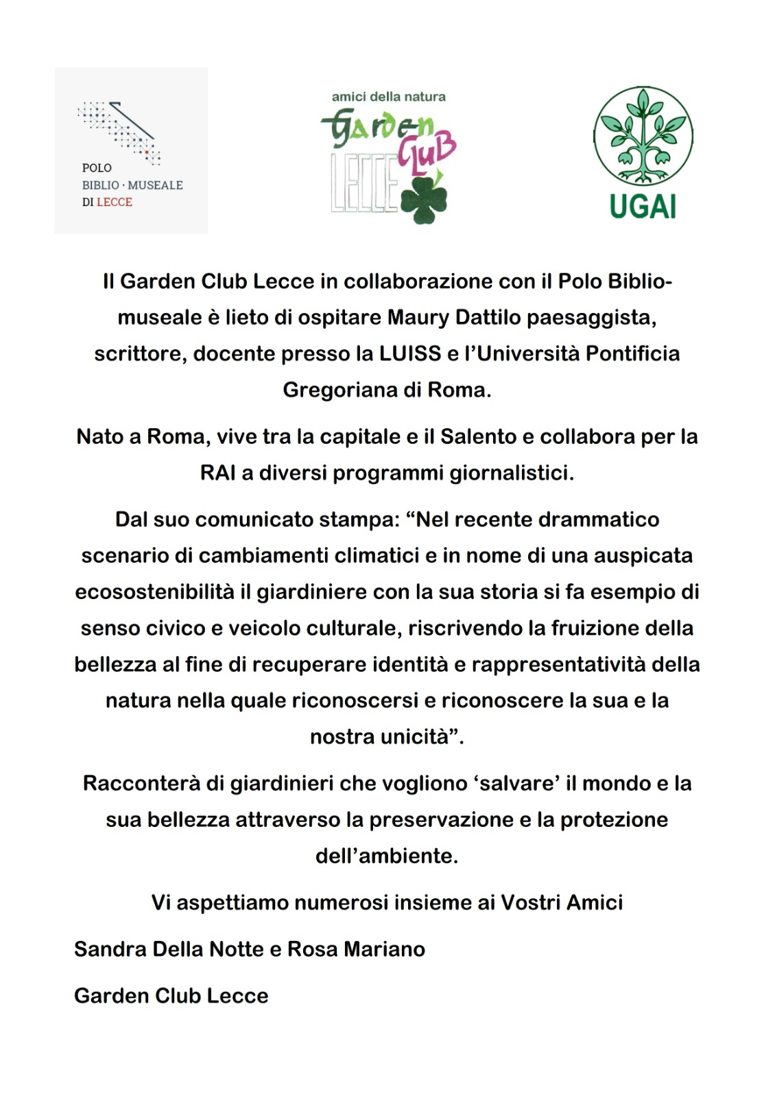 A.Di.P.A. Sezione Puglia – conferenza: “Il Giardiniere Imperfetto” di Maury Dattilo Archivio: Eventi Sezione: Puglia 24 Novembre 2023 Tipo evento: Manifestazione Sezione: Puglia A.Di.P.A. Sezione Puglia è lieta di comunicare che parteciperà all’incontro con Maury Dattilo organizzato dal Garden Club di Lecce per il giorno 01 dicembre 2023.