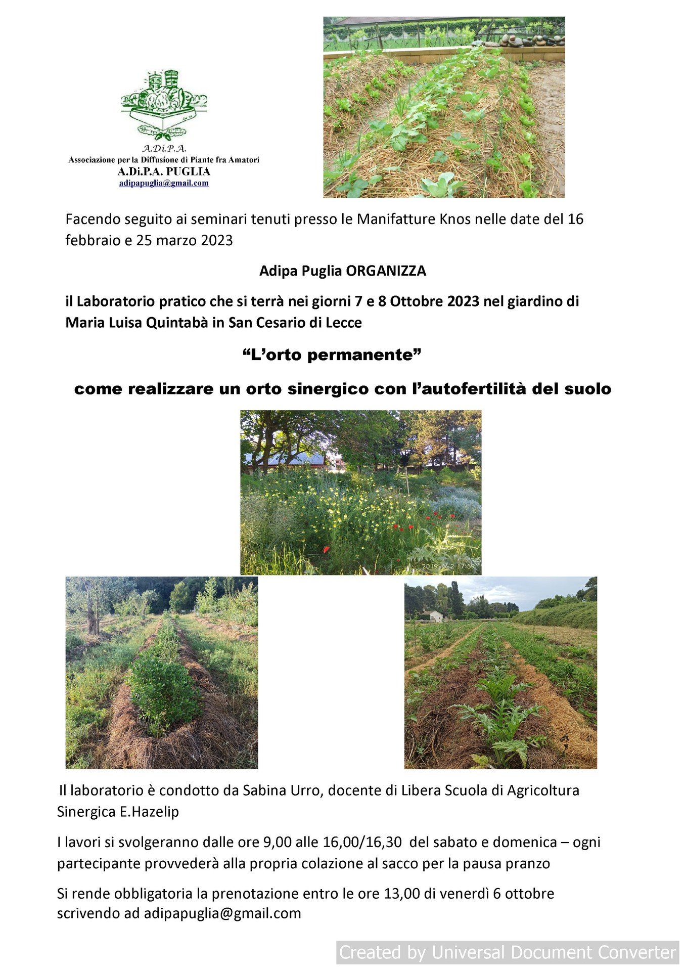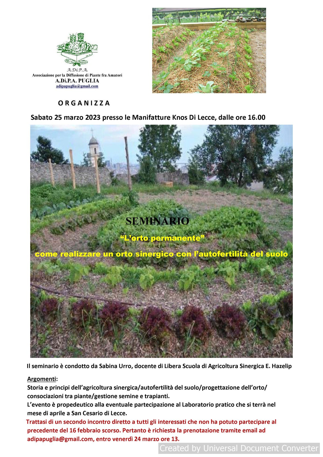 A.Di.P.A. Sezione Puglia ha organizzato con grande successo due seminari sull’orto sinergico che si sono svolti tra febbraio e marzo 2023 presso le Manifatture Knos di Lecce.