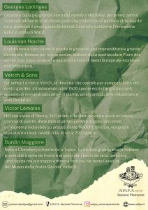 Grazie alla nostra socia e referente culturale Silvia Fogliato, autrice di numerose pubblicazioni incentrate sulla storia della botanica e le biografie dei suoi protagonisti proponiamo il calendario in allegato, che rappresenta un excursus tra i grandi vivaisti europei del 1800, a cavallo tra esplorazioni botaniche in altri continenti e nascenti tecniche di ibridazione e moltiplicazione su grande scala.