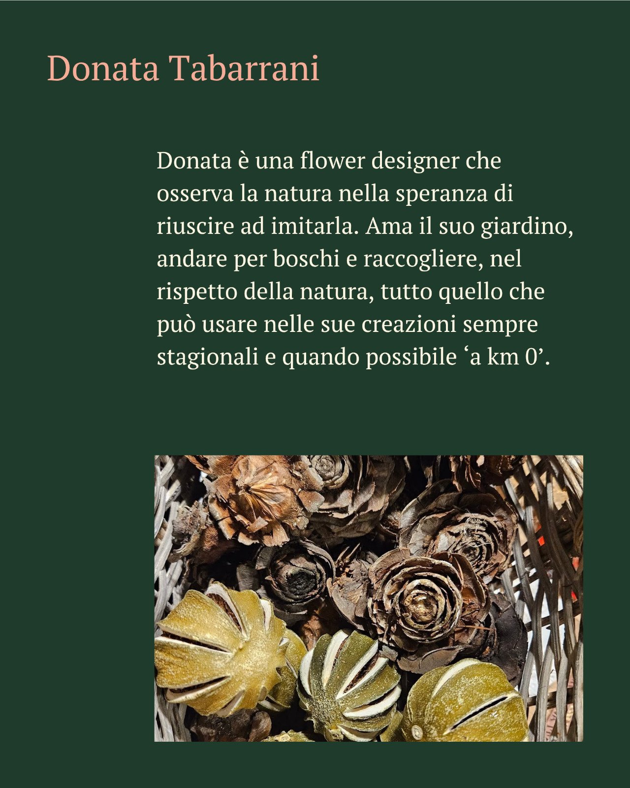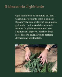 Accompagnati dalle mani esperte di Donata Tabarrani, affermata flower designer, i partecipanti potranno realizzare una ghirlanda con i materiali offerti dalla natura, un’ottima ispirazione per le decorazioni del prossimo Natale.