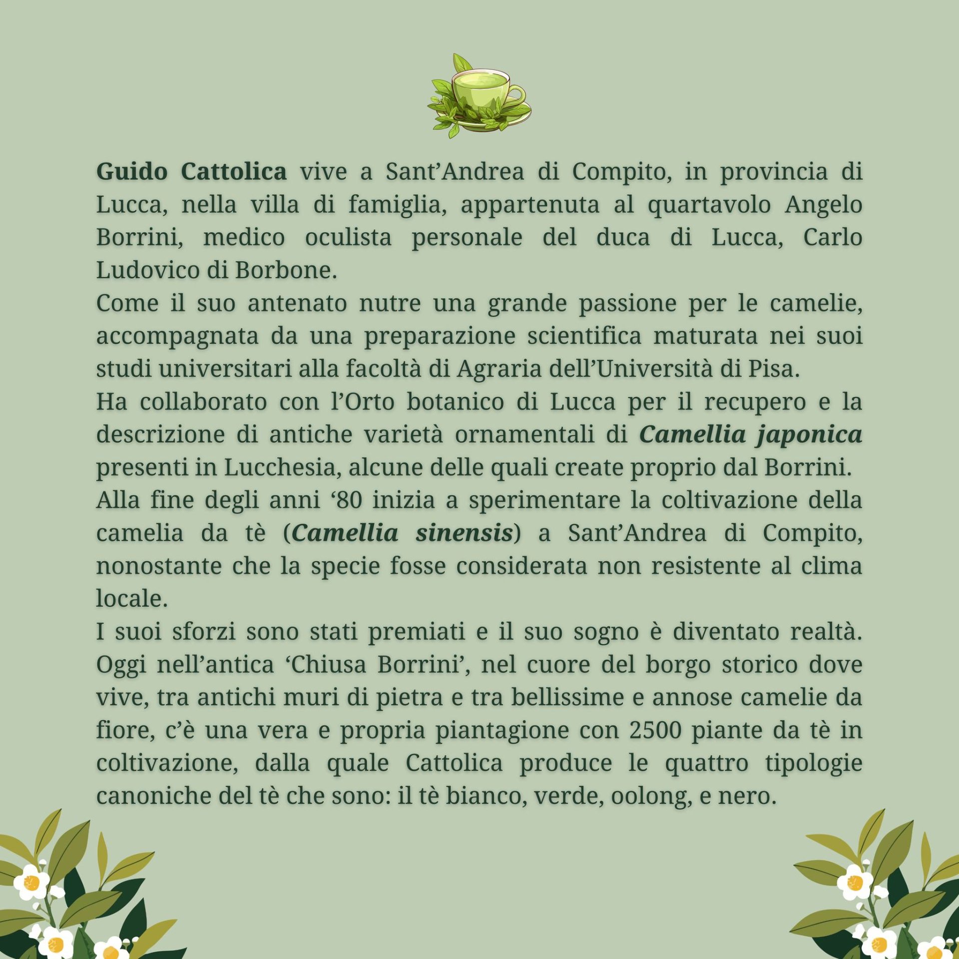 Dal sogno e dalla sperimentazione di Guido Cattolica nella zona del Compitese è stata realizzata una piantagione di camelia da tè da cui si produce davvero un buon tè.