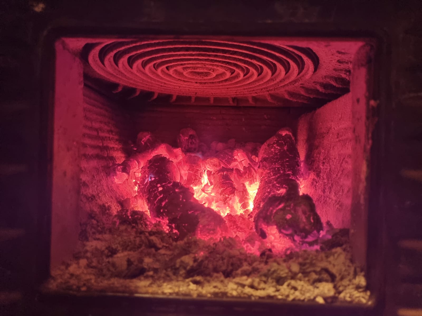 Il lavoro si è svolto agevolmente riscaldato da due fuochi: quello della stufa di Massimo e quello del tramonto sull’arco alpino innevato e con un “collaboratore” insolito, il tenero Hammer.