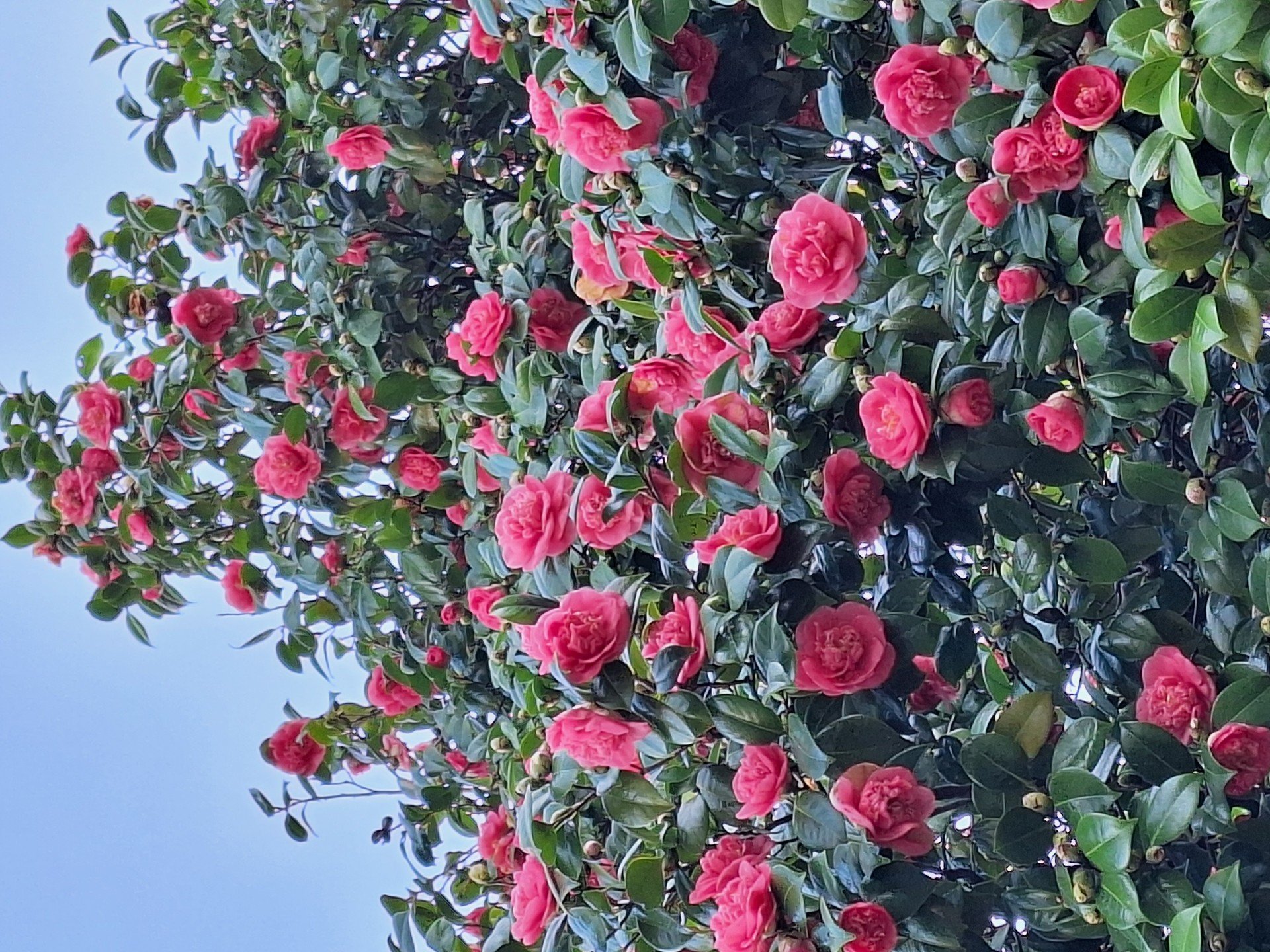 L’esemplare maestoso al centro dei parterre del giardino tergale della Villa è di origine incerta: per alcuni studiosi si tratterebbe di una Camellia japonica L. ‘Diamantina’ per altri della cv ‘Clementine’ .
