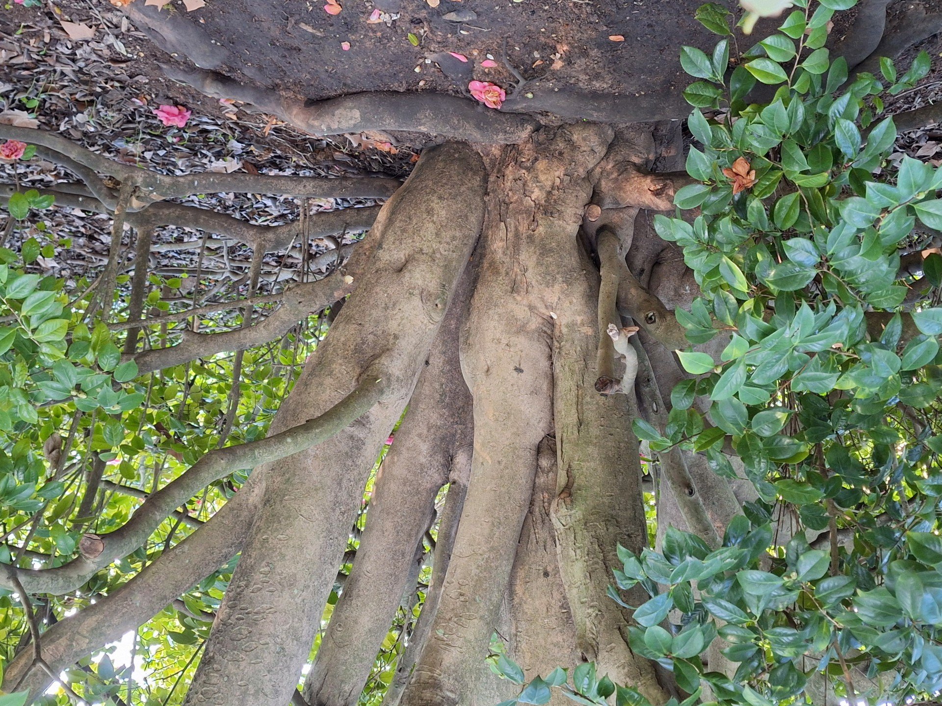 L’esemplare maestoso al centro dei parterre del giardino tergale della Villa è di origine incerta: per alcuni studiosi si tratterebbe di una Camellia japonica L. ‘Diamantina’ per altri della cv ‘Clementine’ .
