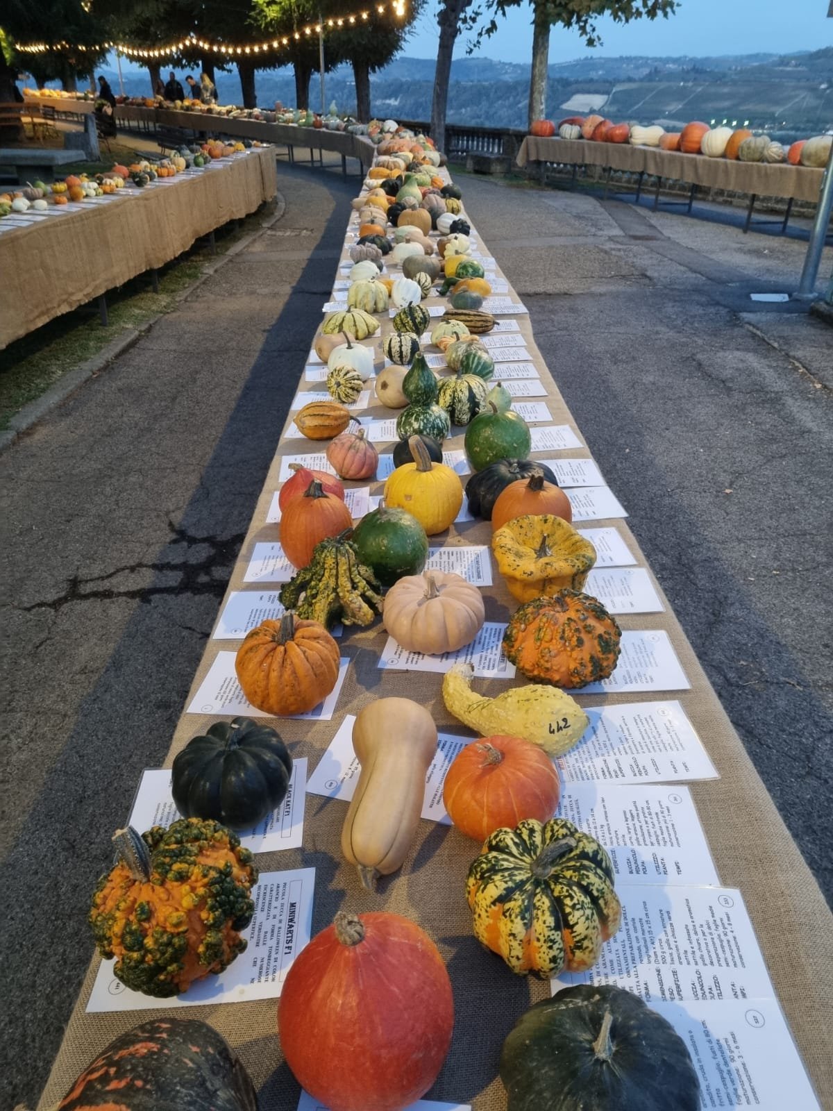 Tra forme variabili e colori intensi, a richiamare il foliage e le terre delle colline circostanti, in lunghi tavoli attraverso l’area centrale della manifestazione erano disposte oltre 600 varietà, tutte corredate di denominazione ed informazioni.
