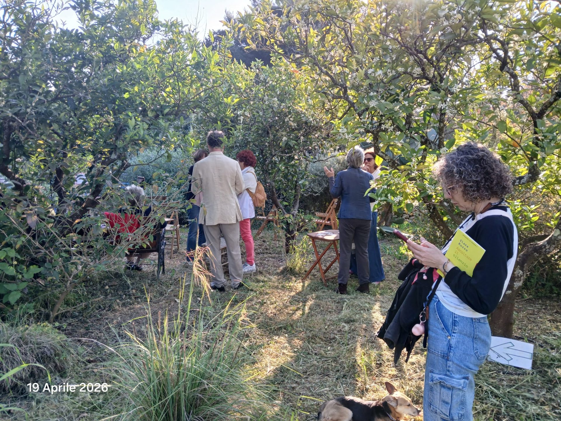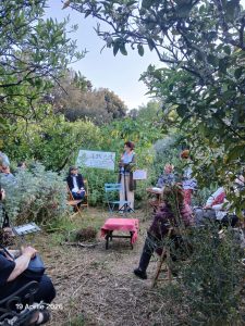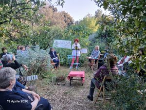 Quindi, seduti in mezzo agli aranci in fiore, i partecipanti hanno letto brani di libri, portati da loro, in cui si richiamavano i temi della salvaguardia della natura insieme a racconti di giardinieri del passato, come il Prof. Cosimo De Giorgi, a poesia composte dai partecipanti, e proverbi in vernacolo. Tutto nella quiete di un pomeriggio caldo e soleggiato circondati dal verde e dai profumi.