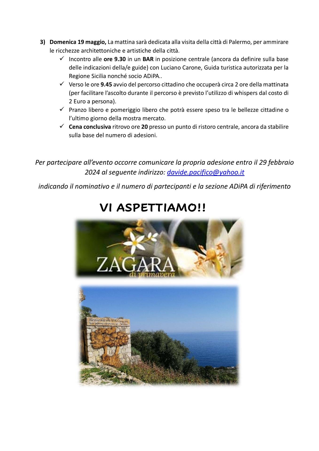 Il RAN – Raduno A.Di.P.A. Nazionale – si svolgerà dal 17 al 19 maggio (per un totale di 3 giorni) durante la manifestazione “Zagara di primavera”, ma molti di noi resteranno fino al 21 sera per visitare altri luoghi di grande interesse della bellissima Palermo.